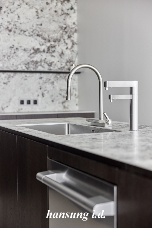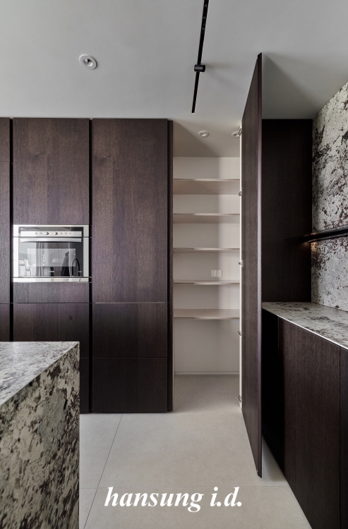 아일랜드 상판은 거실 세라믹과 동일한 마감재를 적용해 공간 전체의 통일감을 유지했으며, 상부에는 마그네틱 레일 조명을 설치해 실용성과 시크한 무드를 동시에 만족시켰다. 가구 도어에는 진한 컬러의 훈증 무늬목을 적용해 안정감 있는 분위기를 연출했다. 나뭇결 패턴이 자연스럽게 살아 있어 단순한 수납 이상의 존재감을 드러낸다. 하부장과 오픈 선반 구조, 코너 펜트리까지 이어지는 키큰장 구성은 수납 효율을 극대화하면서도 디자인의 균형을 유지한다.