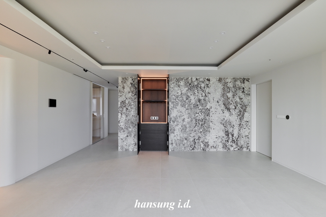 거실은 기존 방 두 개를 철거하고 하나의 넓은 공간으로 재구성했다. 소파와 프로젝터를 중심으로 가족만의 프라이빗 시네마 공간을 연출했고, 맞춤 제작한 붙박이장을 통해 청소기, 와인셀러, 프로젝터 장비 등을 숨겨 정돈된 인상을 유지한다. 접이식 도어 구조는 필요에 따라 열고 닫을 수 있어 실용성과 디자인을 동시에 만족시킨다.