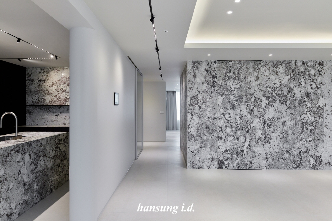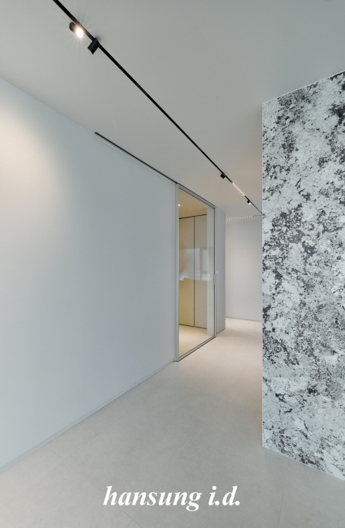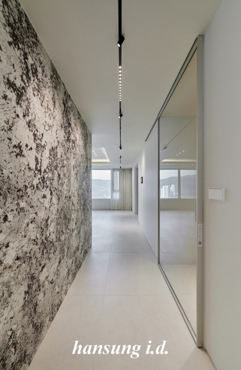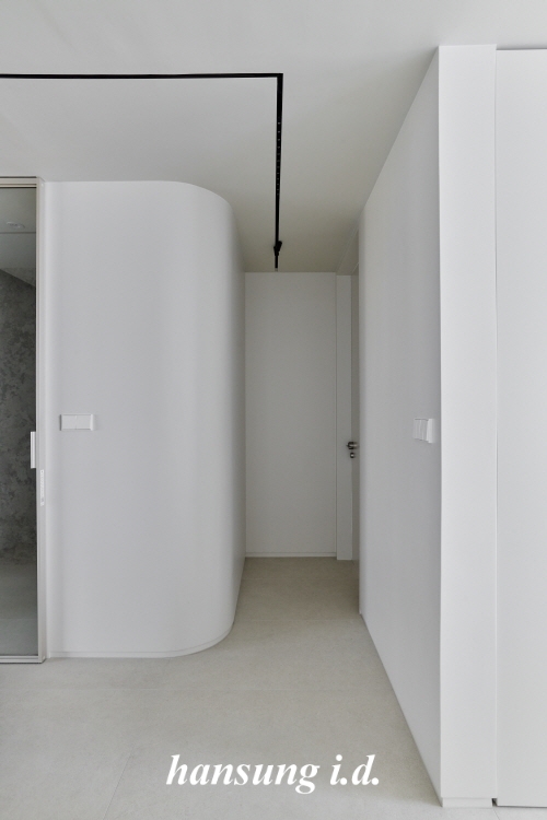 복도 역시 세라믹 타일을 활용해 집의 중심부에 시각적 무게감을 더했다. 양측 벽과 도어는 화이트로 통일해 통일감을 유지하면서, 대형 세라믹 타일이 깊이감과 고급스러움을 강조한다. 단순한 이동 공간이 아닌, 하나의 갤러리 같은 동선으로 재해석한 구성이다.