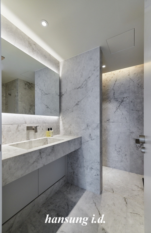 공용 욕실은 기존 욕조를 철거하고 조적 샤워부스로 변경했다. 세면대를 확장하고 타일 세면대를 새롭게 제작해 내구성과 디자인을 모두 고려했다. 동선을 단순화하고 불필요한 요소를 덜어내, 호텔과 같은 정돈된 분위기를 완성했다.