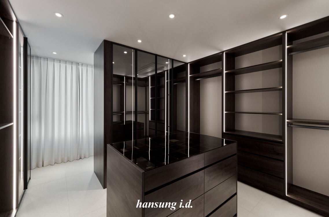 드레스룸은 고객의 라이프스타일을 반영해 오픈형 수납장 중심으로 재구성했다. 일부 수납장에는 브론즈 유리와 반사 유리를 적용해 고급스러운 디테일을 더했으며, 인접한 공간까지 확장해 수납 효율을 극대화했다. 연결된 파우더룸은 화이트 무광 마감과 간접 조명으로 정돈된 인상을 주며, 기능과 디자인이 균형을 이루는 공간으로 완성되었다.