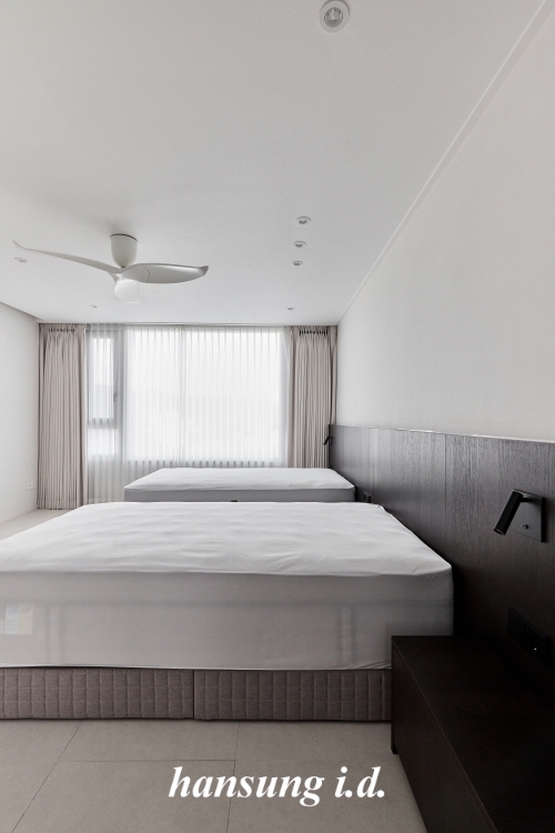 안방은 맞춤 제작 침대 헤드와 훈증 무늬목 마감을 통해 주방과 디자인적 통일감을 이루었다. 무게감 있는 톤은 호텔 스위트룸과 같은 분위기를 형성하며, 휴식에 집중할 수 있는 환경을 제공한다.
