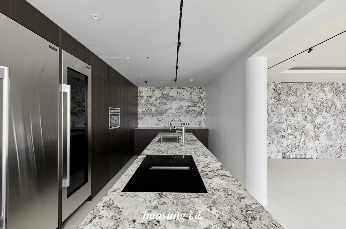 다이닝 공간은 메인 거실과 통합해 보다 개방적인 생활 구조를 만들었다. 복도와 동일한 세라믹 타일을 벽면에 이어 시공해 고급스러운 인상을 유지했고, 홈파기 디테일 안에 홈바를 삽입해 감각적인 포인트를 더했다. 홈바는 세라믹 도어의 히든 구조로 설계해 사용하지 않을 때는 깔끔하게 가려지도록 했다.