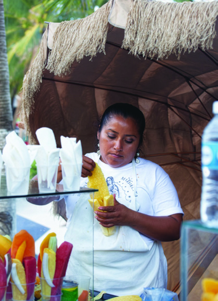 자동차가 전혀 다니지 않는 골목마다 작은 부티크와 기념품을 파는 노점들이 즐비하다. 데이 투어를 예약할 수 있는 작은 여행사들의 호객행위와 거리에 앉아 머리를 땋는 사람들을 보고 있으면 얼핏 방콕의 카오산 로드의 이미지가 오버랩되기도. 뼛속까지 여행자인 사람으로 채워지니 거리는 언제나 자유분방하고 활기찬 분위기일 수밖에 없다. 칸쿤의 여행자들이 화이트닝에 사뭇 신경 쓴, 머리끝부터 발끝까지 잘 차려입은 모양새라면 플라야 델 카르멘의 여행자 행색은 초라하기 그지없다. 온몸이 태양에 그을리고, 바닷물에 시꺼멓게 코팅된 피부로 허름한 반바지에 민소매티를 입고 슬리퍼를 질질 끌고 다니는 히피스러운 이들이 시야에 걸려드는 인구의 반 이상을 차지한다. 게다가 집채만 한 거대 배낭을 짊어멘 젊은이가 수두룩하게 거리를 오고간다. 중절모를 쓴 노인이 그늘아래 앉아 즉석에서 말아 파는 시가의 짙은 냄새가 코끝을 간질이기도 하고. 이게 모두다 플라야 델 카르멘에 ‘배낭여행의 성지’라는 타이틀을 붙이고 싶은 이유들이다.