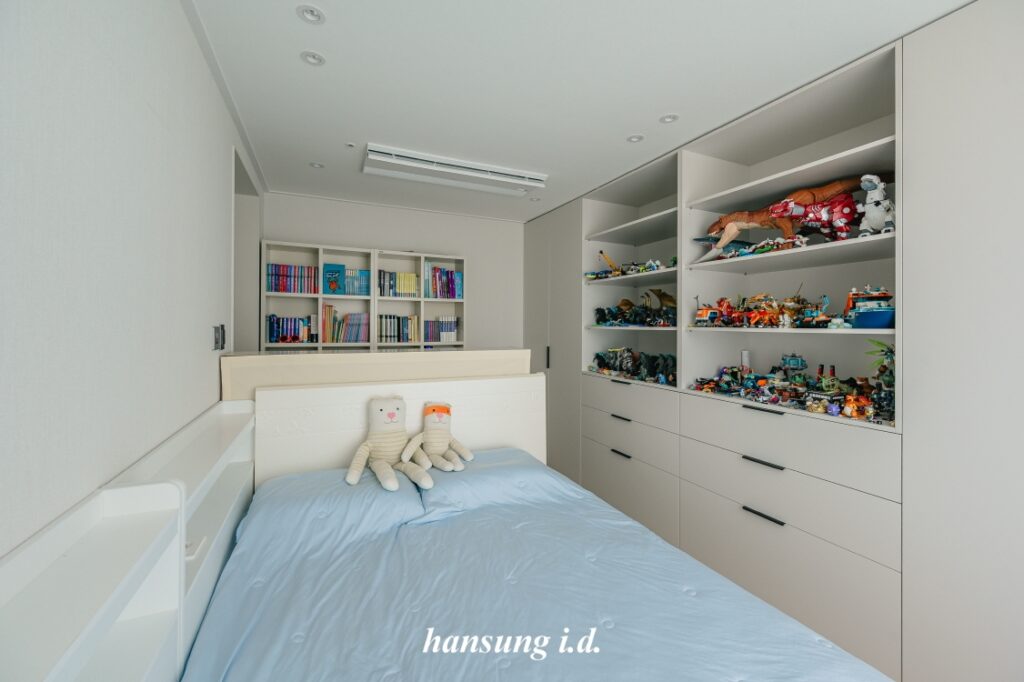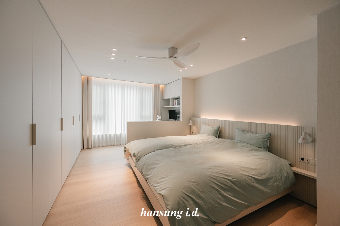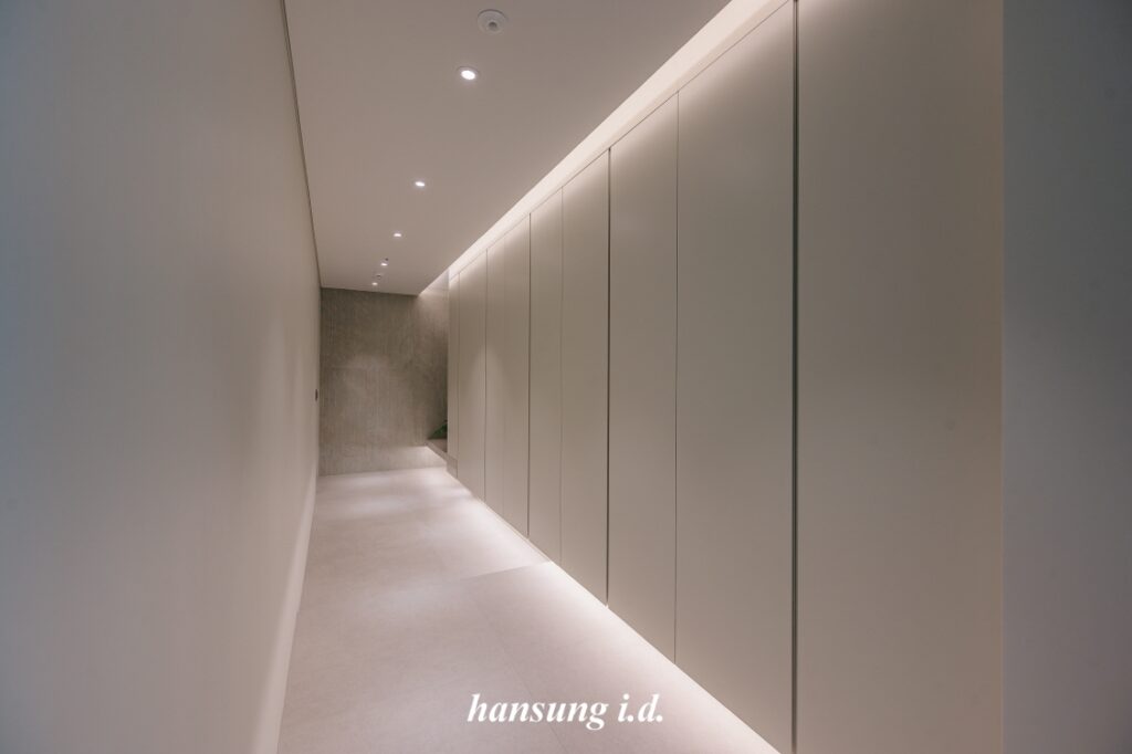 기본적으로 넉넉한 수납이 확보된 구조의 현관은 한쪽 벽에 벤치를 더해 ‘앉아서 신발 신기, 간단한 짐 두기’가 가능한 실용적인 웰컴 공간으로 재탄생했다. 포인트 벽 마감이 더해져 집에 들어서는 순간 깔끔하고 품격 있는 첫인상을 전달한다. 복도는 중앙에 위치했던 중문의 위치를 벽 쪽으로 이동해 시야가 열리고 공간이 자연스럽게 확장되도록 구성했다. 또한 자녀방 일부 면적을 활용해 히든도어 창고 공간을 새롭게 마련, 청소기·캐리어·계절 가전 등을 깔끔하게 숨길 수 있는 실용성과 미적 완성도를 동시에 확보했다.