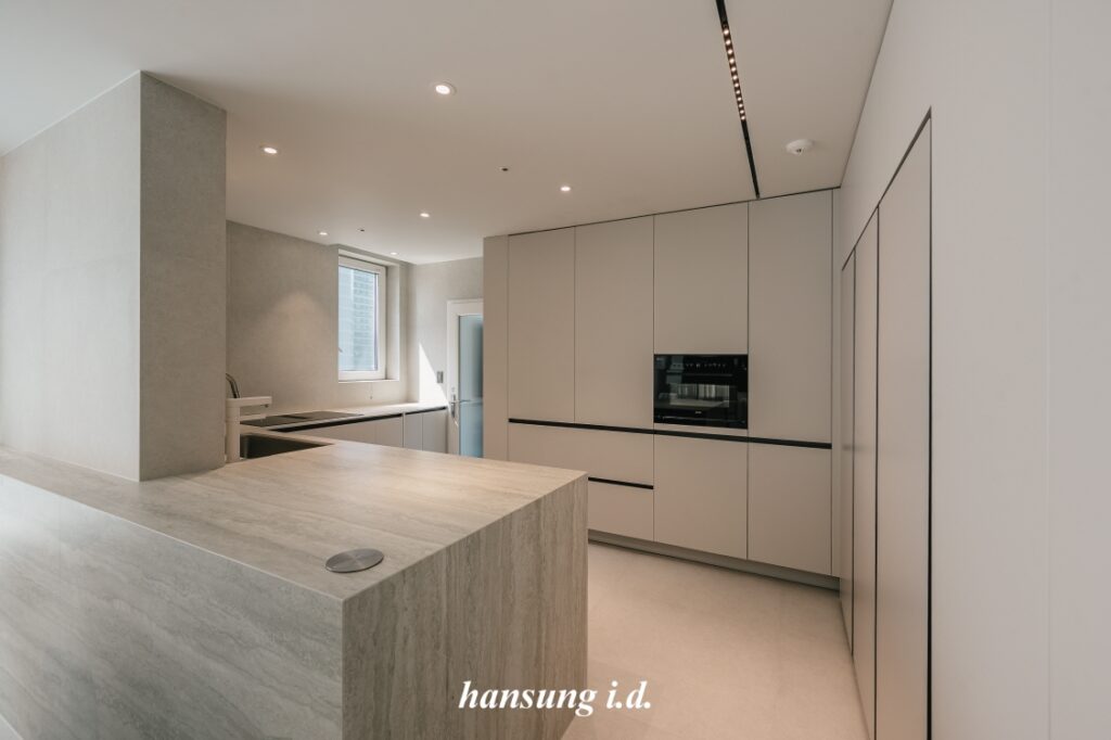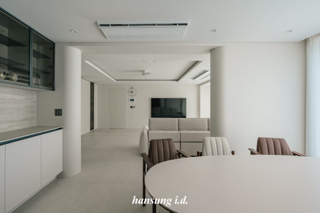 주방은 긴 아일랜드를 중심으로 조리와 작업이 모두 가능한 대면형 구조로 설계했다. 상부장은 과감히 제거해 개방감을 확보하고, 대신 키 큰 수납장을 충분히 배치해 실용성을 채웠다. 화이트 포세린 타일과 패턴 도어가 어우러진 주방은 정돈되고 모던한 분위기를 선사한다. 다이닝룸은 라운드 벽 디자인으로 부드러운 인상을 만들었고, 곡선의 흐름이 이동 동선에 리듬감을 더한다. 한쪽 벽에는 상·하부장을 구성해 수납·장식·가전 정리가 가능한 유용한 공간으로 활용했다.