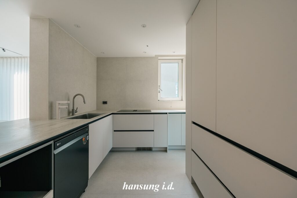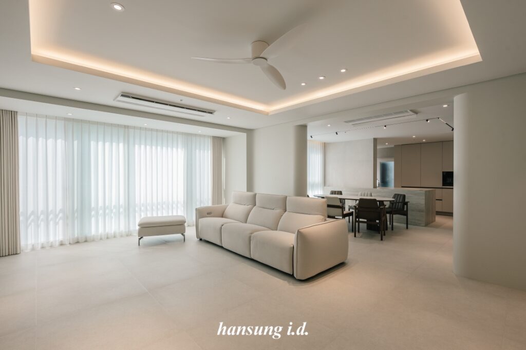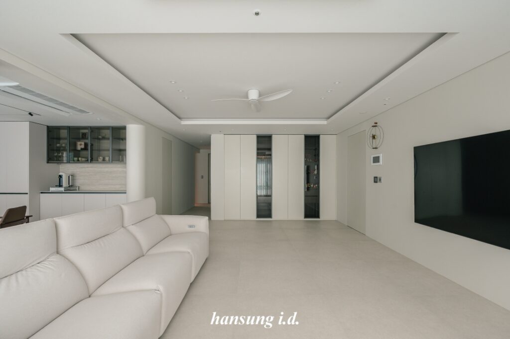 확장 시공으로 면적이 넓어진 거실은 처음 들어서는 순간 시원한 시야가 펼쳐지는 공간으로 완성되었다. 안방 출입구는 히든 도어 디자인으로 아트월과 자연스럽게 통합해 시각적 노이즈를 최소화하고 미니멀한 분위기를 유지했다. 화이트 도장 벽면, 매트 질감의 바닥재, 간접 조명·레일 조명의 조화가 정적인 여백의 미를 극대화한다.