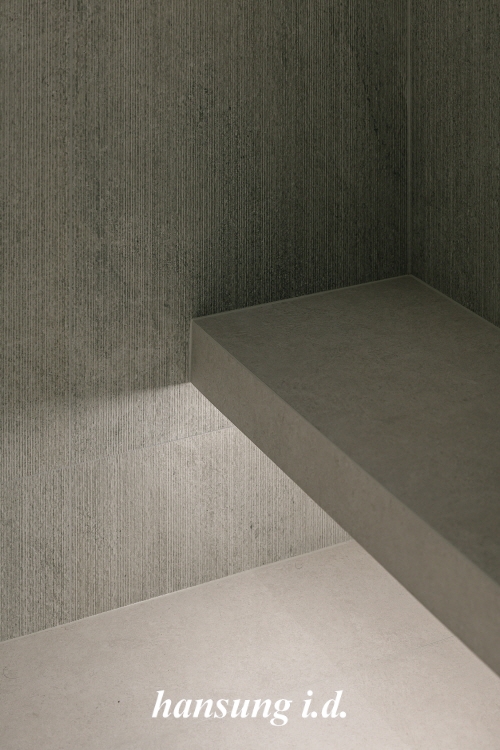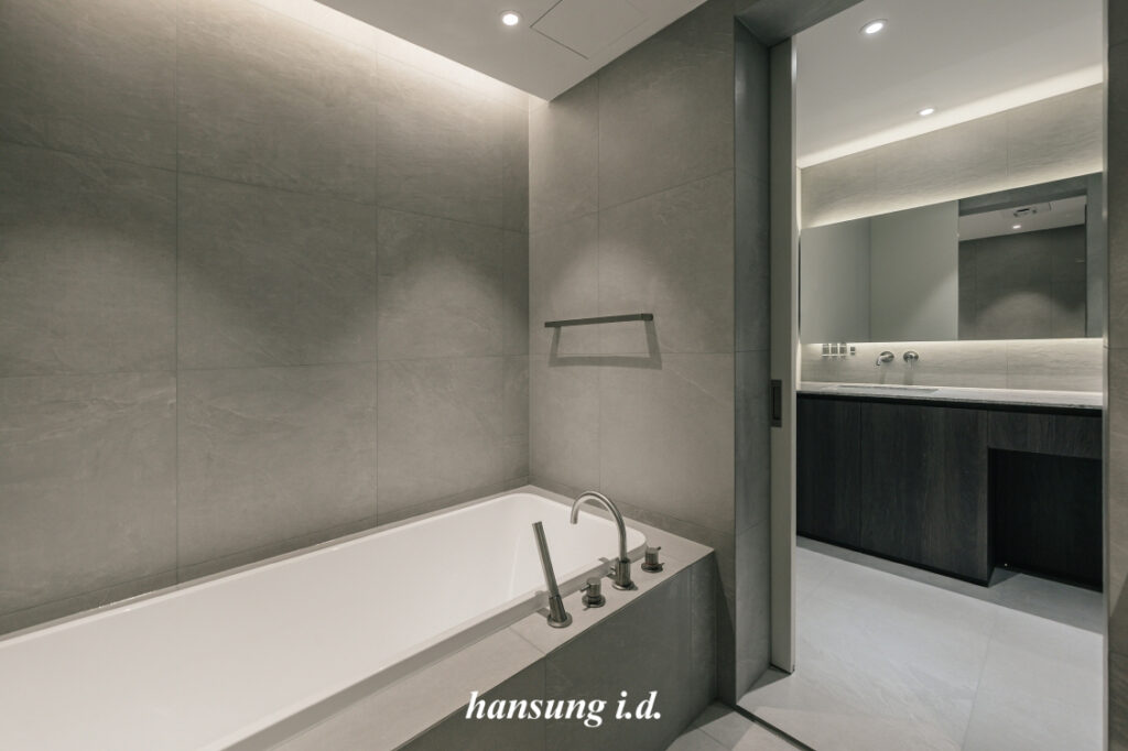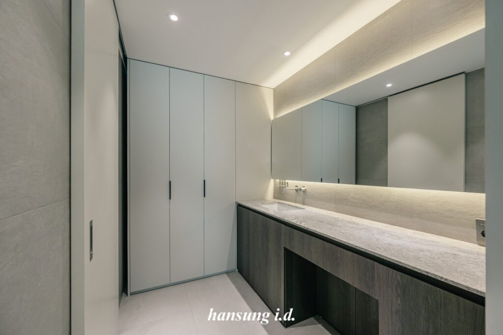 안방은 넓은 면적을 활용해 한쪽에 가벽을 세우고 컴팩트한 미니 서재 공간을 마련했다. 작업·독서 등 다양한 용도로 활용 가능한 조용하고 프라이빗한 코너다. 다른 면은 붙박이장으로 구성해 넉넉한 수납을 확보하고 공간을 군더더기 없이 정돈된 라인으로 마감했다. 안방 욕실은 고객의 요청에 따라 샤워실과 욕조, 두 기능을 모두 갖춘 구조로 전면 재배치했다. 세면대를 외부 화장대 구역으로 이동시키며 샤워실, 욕조, 변기 공간이 분리된 호텔식 레이아웃을 완성했다.