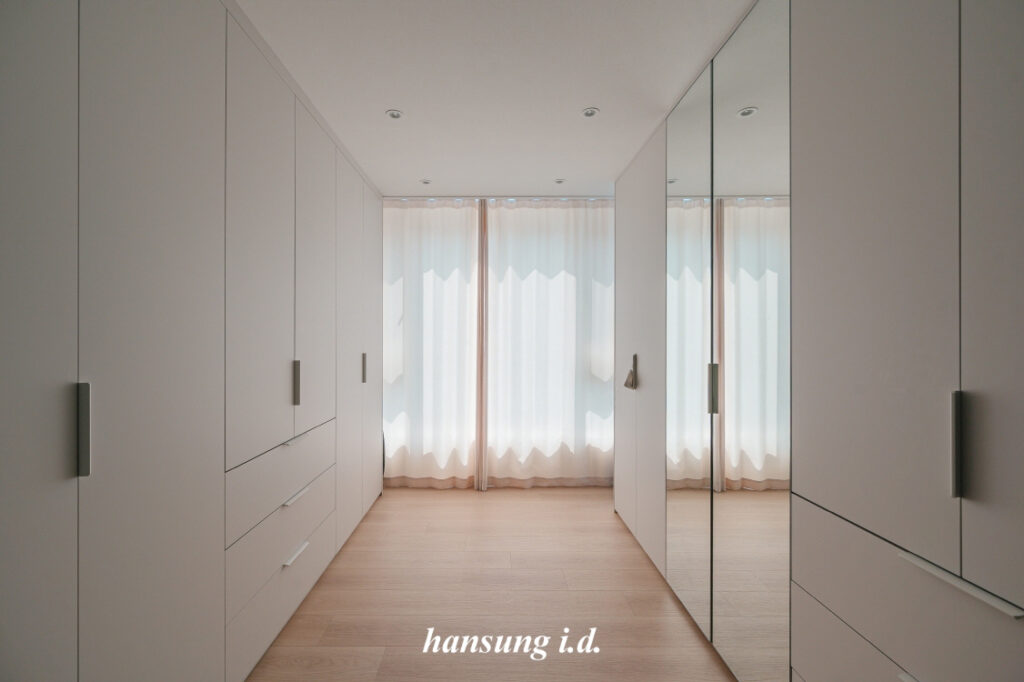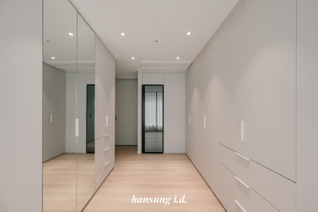 드레스룸은 3면을 가득 채운 붙박이장으로 구성해 옷·가방·잡화까지 체계적으로 정리 가능하도록 구성했다. 가족 구성원 모두의 수납을 해결한 실용적 공간으로, 54평형 인테리어 중에서도 만족도가 높았던 구역이다.