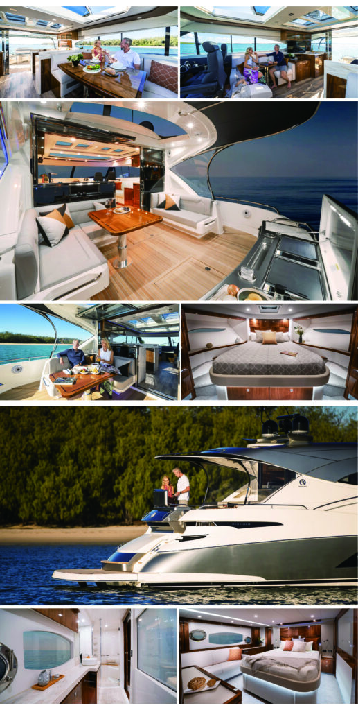 이제 조종석에 2개, 조타실에 1개 총 3개의 조이스틱 제어 포인트가 있다. 검은색과 은색의 콕핏은 고급스러운 신형 알칸타라와 가죽 레카로(Recaro) 조타 장치와 최첨단 계기판으로 감동을 선사한다. 최첨단 볼보 펜타 950 인보드 퍼포먼스 시스템이 탑재되어 있다. 궁전 같은 객실 데크에는 욕실 3개가 있는 3개의 선실 또는 4개의 선실, 그리고 다용도실 또는 승무원실이 마련되어 있다.