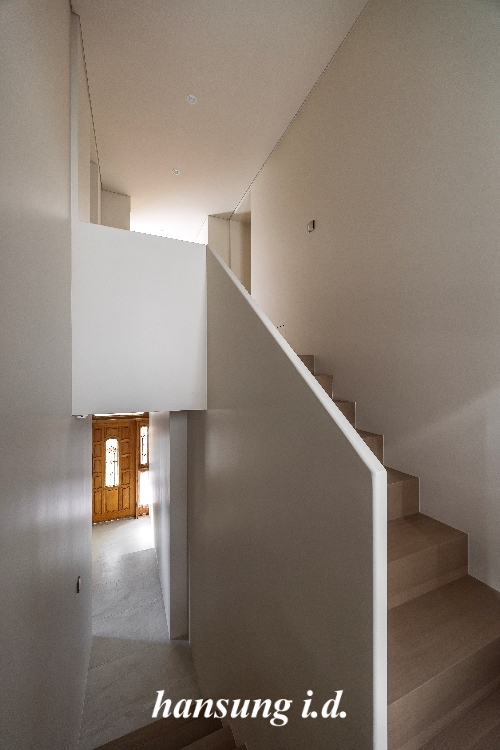 방배동 주택의 현관은 길고 좁은 구조를 그대로 살리면서도 공간이 답답하게 느껴지지 않도록 설계했습니다.벽과 천장을 진한 베이지 톤으로 마감해 높은 층고가 더욱 부각되도록 했으며, 1200×1200 대형 타일로 바닥의 스케일을 정돈하고 차분하고 단단한 첫인상을 완성했습니다.복도를 지나 마주하게 되는 계단실은 벽·천장과 동일한 매스로 이어지는 솔리드한 난간으로 하나의 조형처럼 느껴지도록 구성했습니다. 계단 상부에는 베를린에서 공수한 Kaspar Müller 작가의 오브제 조명을 설치해 은은한 포인트를 더해주었습니다.현관을 지나 이어지는 복도는 이번 프로젝트에서 공간의 흐름을 이어주는 중심 동선으로 계획했습니다. 길게 뻗은 구조를 단점으로 두지 않고, 시선이 자연스럽게 이어지도록 벽과 천장을 동일한 베이지 톤으로 정리해 단독주택 특유의 깊이감을 살렸습니다. 한쪽 벽면에는 수납장을 매립 시공해 돌출 없이 정돈된 인상을 유지했고, 중앙에는 트라버틴 패턴의 니치를 더해 간접조명과 함께 공간에 입체감을 부여했습니다.