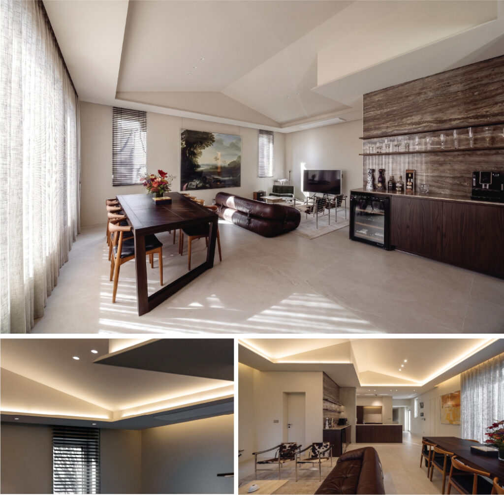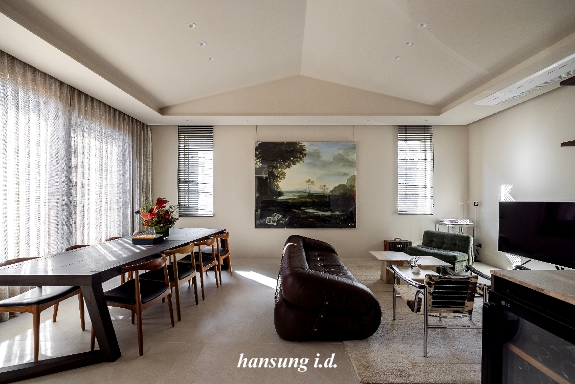 단독주택 리모델링의 장점을 살려 천장을 최대한 높이고 구조를 정리해 층고의 개방감을 온전히 드러낸 모습을 보여줍니다. 직접 조명은 최소화하는 대신 간접조명을 충분히 배치해 지붕의 형태가 자연스럽게 강조되도록 계획했습니다. 벽면은 따뜻한 베이지 톤으로 정리해 층고가 높아도 차갑지 않게, 아늑함이 유지되도록 색감을 선택했습니다. 가구는 진한 브라운 레더 소파와 우드 테이블, 빈티지 체어를 매치해 주방의 월넛 톤과 자연스럽게 연결했습니다. 대형 아트월은 시선을 모아주는 중심 요소로, 양쪽 창으로 들어오는 빛과 어우러지며 거실의 표정을 완성합니다. 블라인드와 쉬어 커튼을 함께 사용해 시간대에 따라 빛의 양을 유연하게 조절할 수 있도록 했습니다. 거실과 자연스럽게 이어지는 다이닝 공간은 큰 창을 따라 배치해 빛을 충분히 끌어들였습니다. 서향집 위주였던 채광 구조를 개선해 시간대에 따라 달라지는 빛의 결이 실내 깊숙이 스며들도록 계획했습니다. 긴 우드 테이블과 동일한 우드 계열 의자로 차분하면서 안정적인 분위기를 완성했습니다.게 이어지도록 벽과 천장을 동일한 베이지 톤으로 정리해 단독주택 특유의 깊이감을 살렸습니다. 한쪽 벽면에는 수납장을 매립 시공해 돌출 없이 정돈된 인상을 유지했고, 중앙에는 트라버틴 패턴의 니치를 더해 간접조명과 함께 공간에 입체감을 부여했습니다.