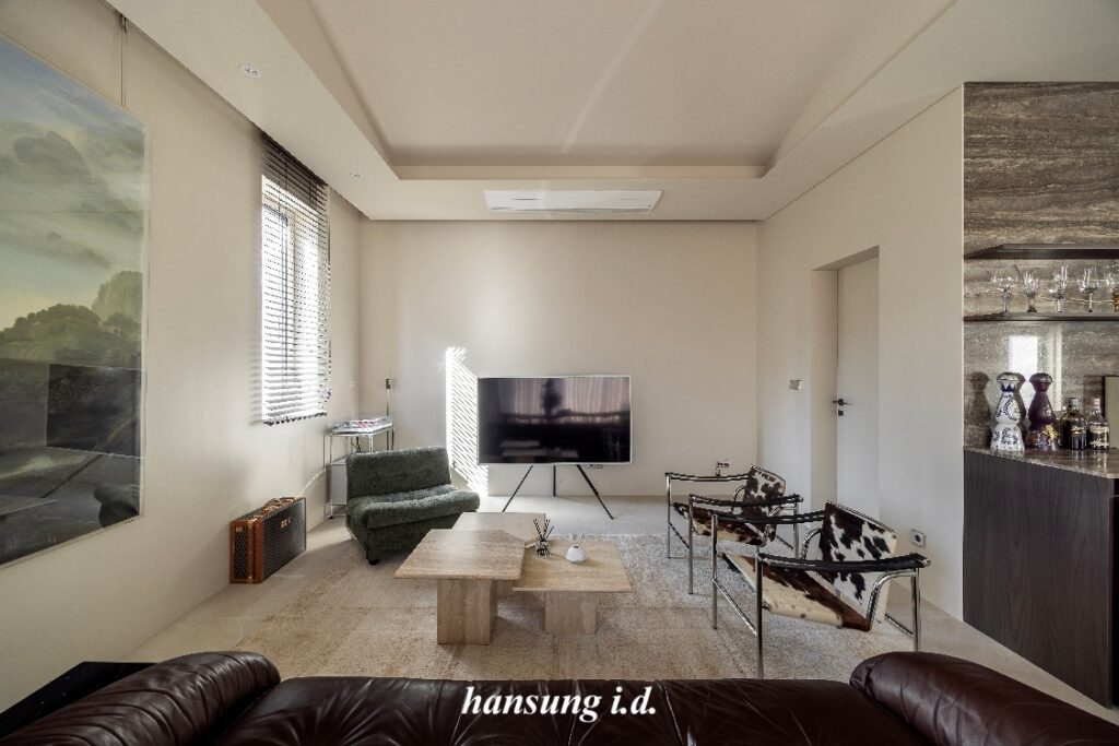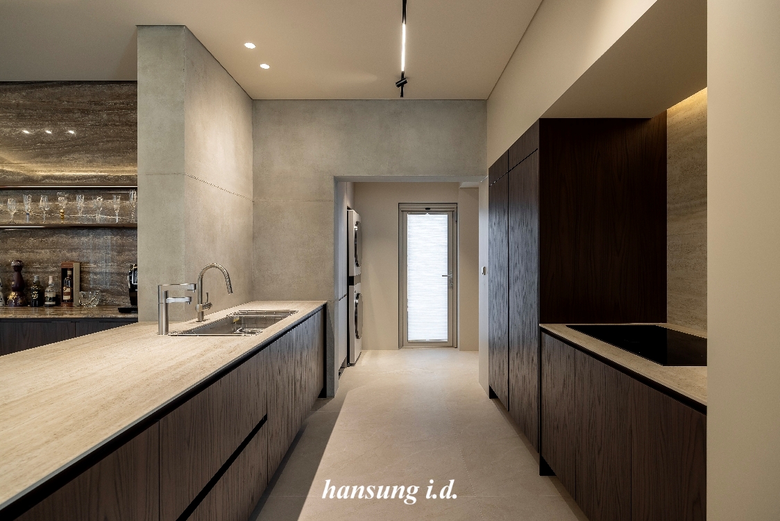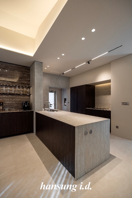 기존의 막혀 있던 구조를 정리하고 아일랜드를 축으로 시선이 자연스럽게 거실까지 이어지도록 설계해 방배동 인테리어 특유의 개방감을 강조했습니다. 천장은 최대한 단순하게 정돈해 불필요한 단차를 줄이고, 간접조명과 라인 조명을 조합해 넓어진 구조가 더욱 돋보이도록 연출했습니다. 아일랜드 상판은 고객님이 선호하셨던 트라버틴으로 마감했습니다. 결이 살아있는 석재의 질감이 묵직한 중심을 잡아주며, 바 테이블처럼 활용할 수 있는 길이감으로 실용성까지 고려했습니다. 하부장은 진한 월넛 우드로 구성해 베이지 톤의 타일 바닥과 대비를 이루도록 했습니다. 주방 벽면에는 노출 콘크리트를 적용해 재료 본연의 질감을 드러냈는데요. 트라버틴, 월넛, 콘크리트가 서로 조화를 이루며 익숙하지 않은 새로운 무드를 만들어냅니다. 홈바 공간에는 석재 백패널과 오픈 선반을 더해 잔과 소품이 하나의 장식 요소가 되는 장면을 연출했습니다. 라인 조명과 간접 조명을 활용해 층고의 장점을 살리고, 빛이 벽과 천장을 타고 흐르며 넓고 여유로운 주방 분위기를 완성합니다.