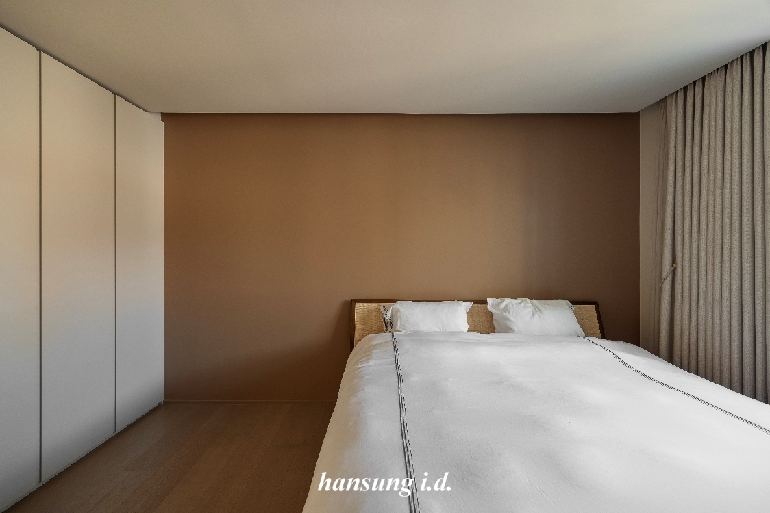 진한 우드 프레임의 침대를 중심으로 공간의 무게감을 잡아주었습니다. 침대 헤드보드 벽면에는 카멜 컬러를 적용해 우드 톤과 자연스럽게 어우러지도록 했습니다. 한쪽 벽면은 붙박이장으로 정리해 돌출 없이 깔끔한 인상을 유지했고, 베이지와 브라운 계열을 중심으로 톤을 맞춰 시각적으로도 편안함이 이어지도록 구성했습니다. 안방 욕실의 세면대는 공용 욕실과 동일하게 결이 살아있는 석재 상판으로 마감하고, 하부장은 우드 톤으로 맞춰 안방과 이어지는 분위기를 유지했습니다. 거울은 벽면을 넓게 활용해 시야가 확장되도록 하고, 상·하부 간접조명을 더해 빛이 부드럽게 퍼지도록 설계했습니다.