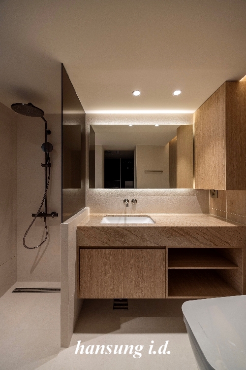 공용 욕실은 소재의 질감이 돋보이도록 불필요한 장식을 덜어낸 간결한 구성으로 정리했습니다. 세면대는 다이노임페리얼 계열의 석재 상판으로 마감해 묵직한 존재감을 더했습니다. 결이 살아있는 패턴이 자연스럽게 시선을 끌며 차분한 분위기를 형성합니다. 거울은 상부 라인을 정리해 은은한 간접 조명이 자연스럽게 퍼지도록 했고, 수전과 벽부등은 메탈 포인트로 통일해 절제된 고급스러움을 완성했습니다.