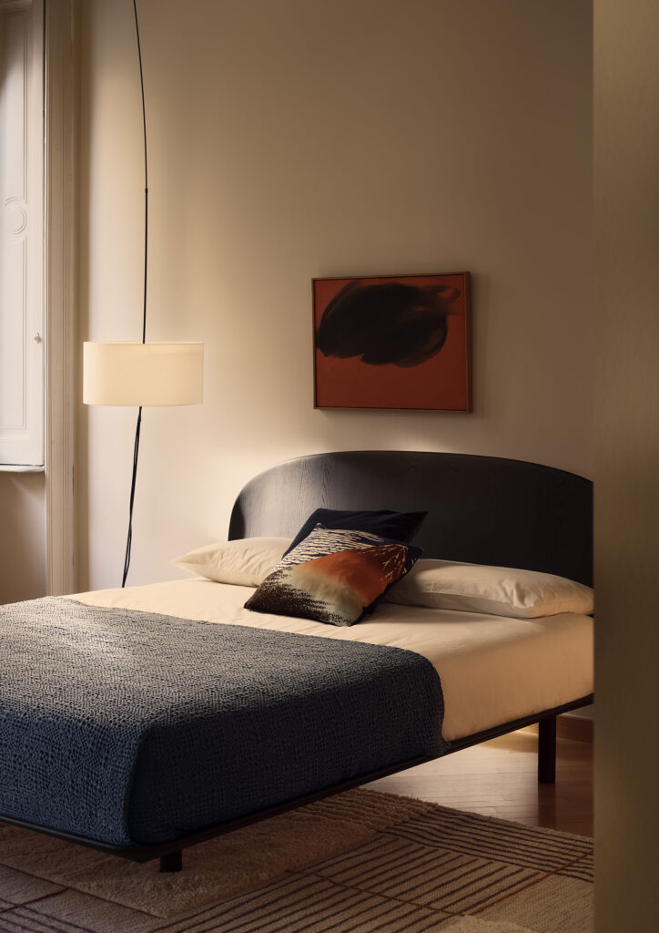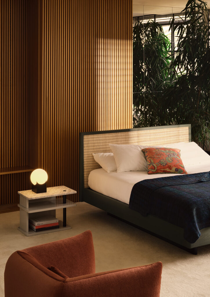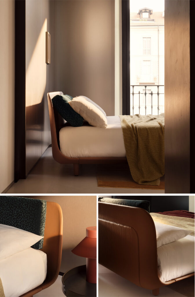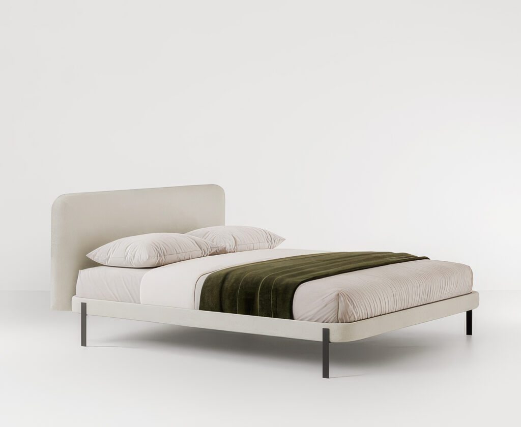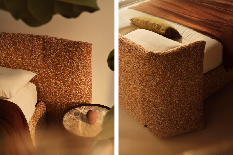디자인 스튜디오 에그스(e-ggs)가 제안하는 ‘마티(Marty)’는 침실을 단순히 잠자는 곳이 아닌 적극적인 ‘머무름의 공간’으로 재정의합니다. 소파의 등받이를 연상케 하는 넉넉하고 푹신한 패브릭 헤드보드는 일상 속 완벽한 쉼을 유도합니다. 침대 측면에 결합할 수 있는 전용 트레이 액세서리는 카라라 대리석 또는 래커 마감 중 선택 가능하며, 실용적인 거치 공간이자 침실의 우아한 건축적 포인트 요소로 작용합니다.